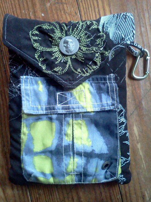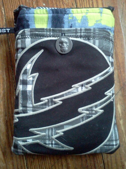 In classic Jaime fashion, this is my second attempt at this post due to the fact that my first attempt randomly included a pic of my bright-white, bare legs– tattoos and all– for reasons unbeknownst to moi. Sorry if I burned anyones eyes…it’s all good. So here we go again… I wanted to do a post on a recent family collaboration. In February, I gifted my brother my old Kindle and he loathed the case it came with, saying it looked like a pair of my underbritches. So he drew out a design and sent me the materials and this is the end result. Pretty cool! It’s made with a plastic bubble mailer which will protect it from falls and rain. It’s lined with a reused terrycloth towel to help keep the screen clean. The awesome skull buttons are extras from a pair of jeans he loves. And here comes the irony: wait for it…wait for it…The fabric comes from three pairs of his swimming underbritches. Hah! Plus there are two pockets: one for the cord and one for his wallet and such. And a clip for his keys. Not too shabby of a collab if I may say so. If you plan to try this, let me know if you have any questions. It’s a breeze if done in the proper order.