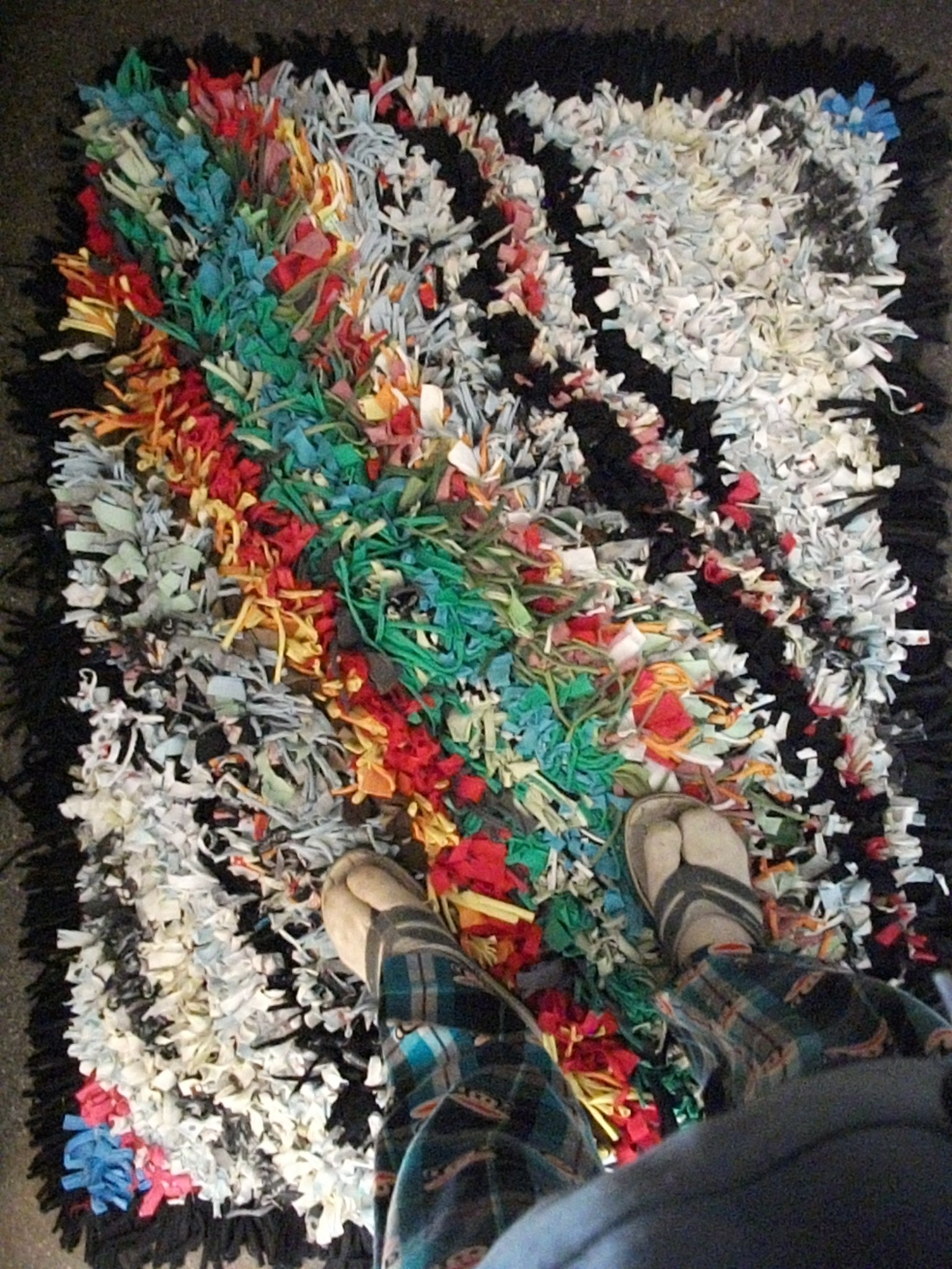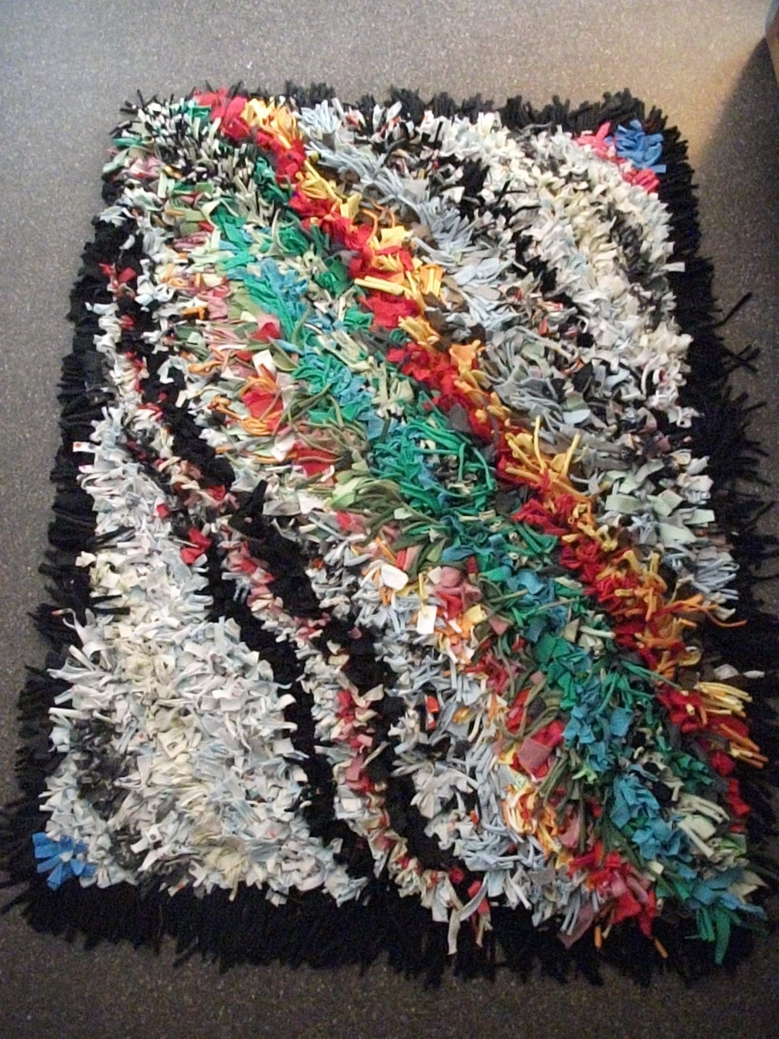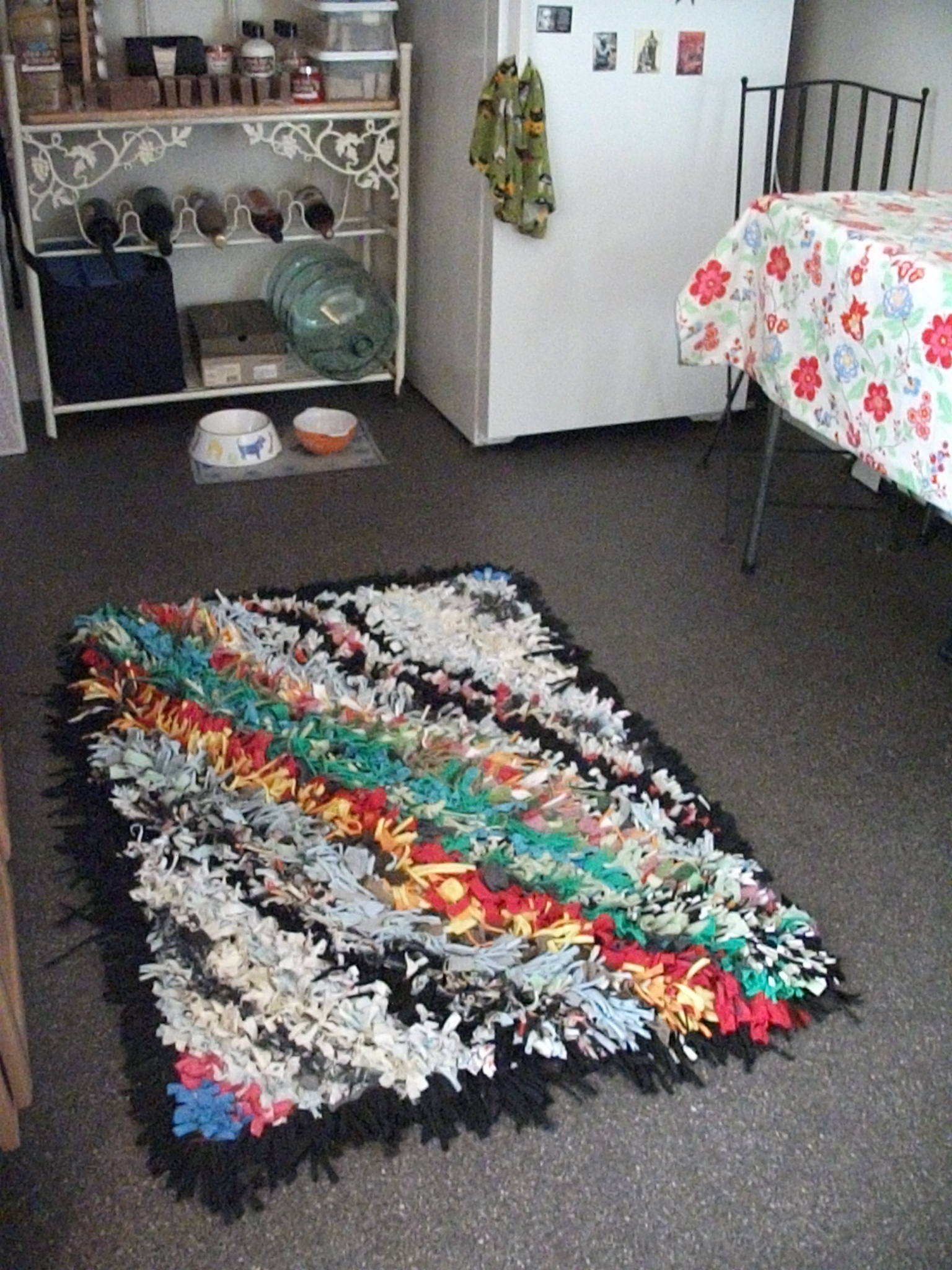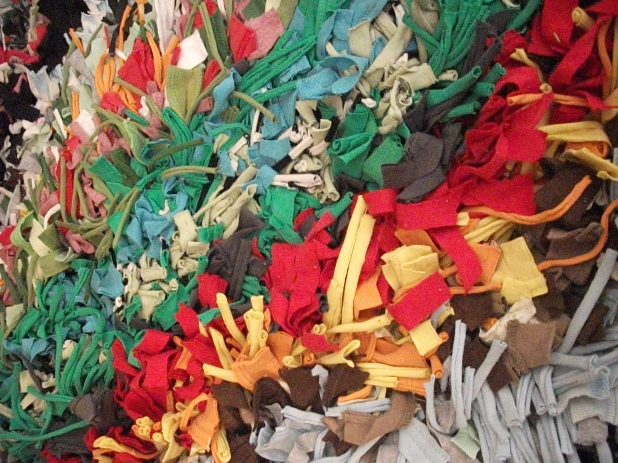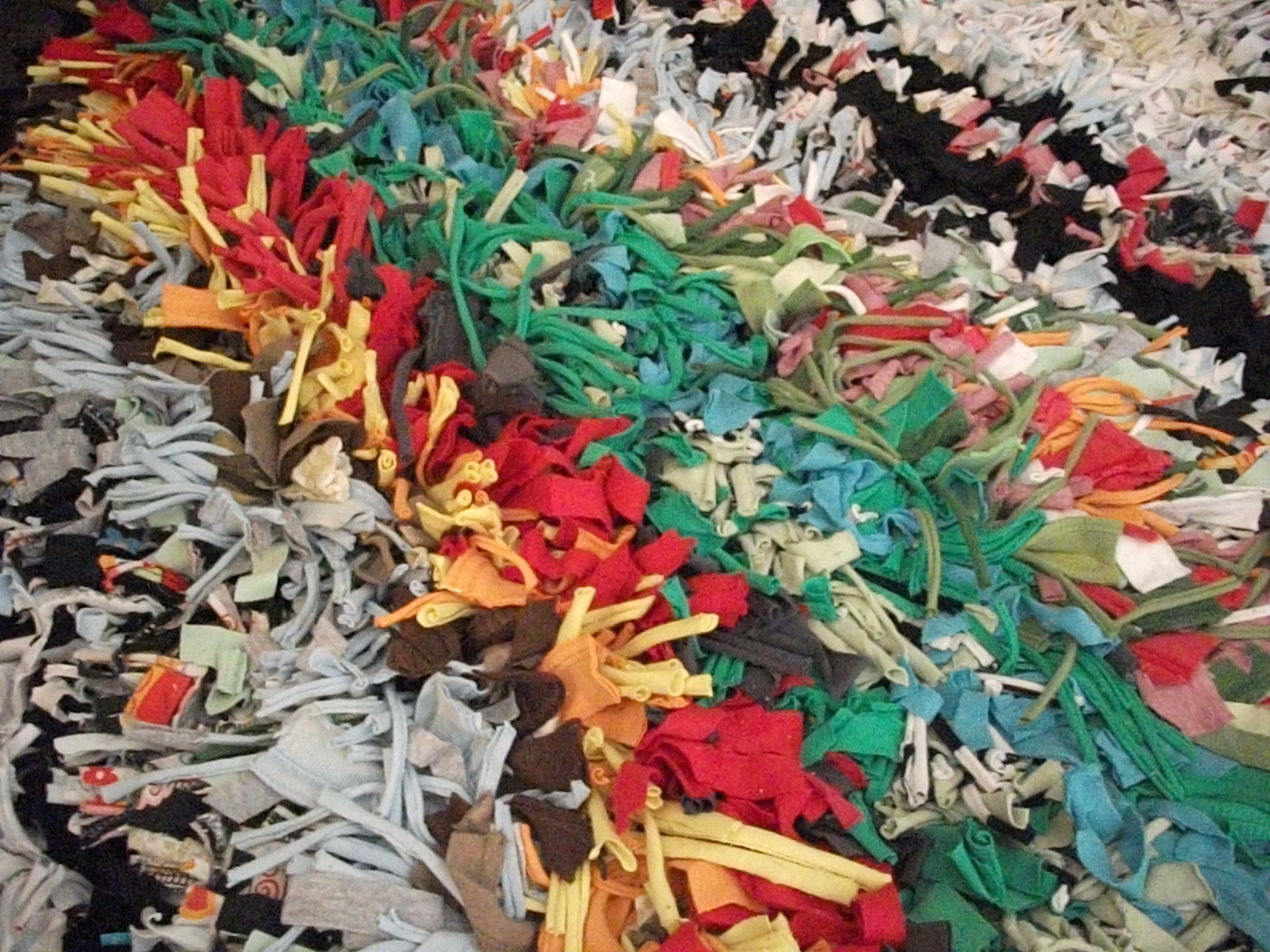 And although t-shirt quilt making is totally awesome, it generates a lot of waste. If you’re like me, you feel bad throwing out all that good fabric so you hoard it. You hoard it to the point that you actually have a contractor bag full of this crap and you’re perfectly willing to haul all 50 pounds of it from your home, to the storage unit, and then into your tiny new apartment. No biggie, it’s all in a days work for the avid sewist! I knew eventually this collecting would pay off at some point. And did it! A few months ago I found a t-shirt rug tutorial on one of the gazillion diy blogs I stalk. Bingo! Instant affirmation that hoarding does indeed pay off. So here’s how it turned out: