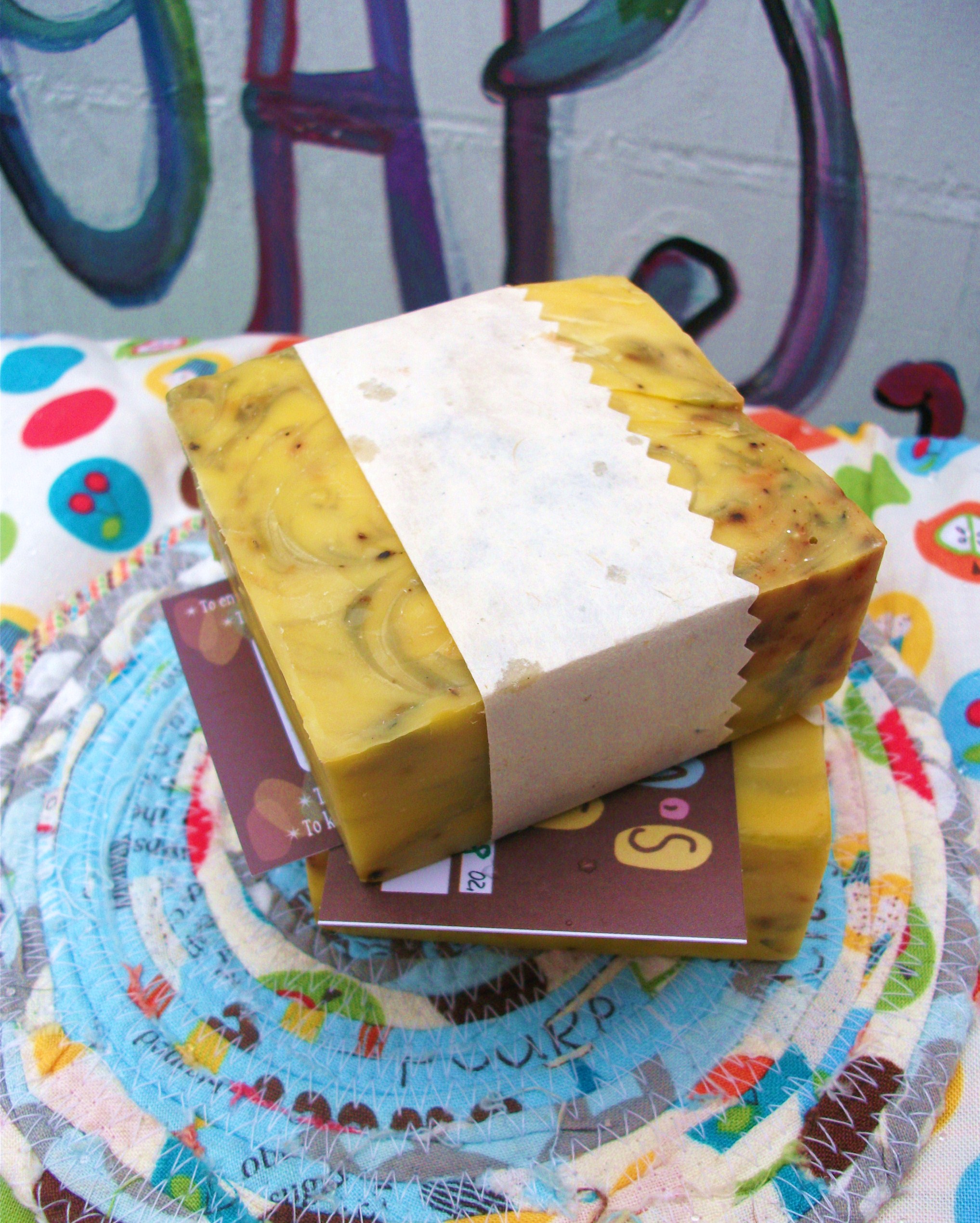 Not too shabby. My only regret is that I swirled too much. One swirl around the pot with a spoon or knife is plenty. Well slap my hand, I was having too much fun and I took two trips around. Nevertheless, it’s awesome and I’m selling a few bars in my Etsy store. They’re made with vegetable oils, 100% carrot juice, natural colorants, and are scented with basil and sweet orange essential oils. They smell pretty amazing–very much like a fragrant herb garden.