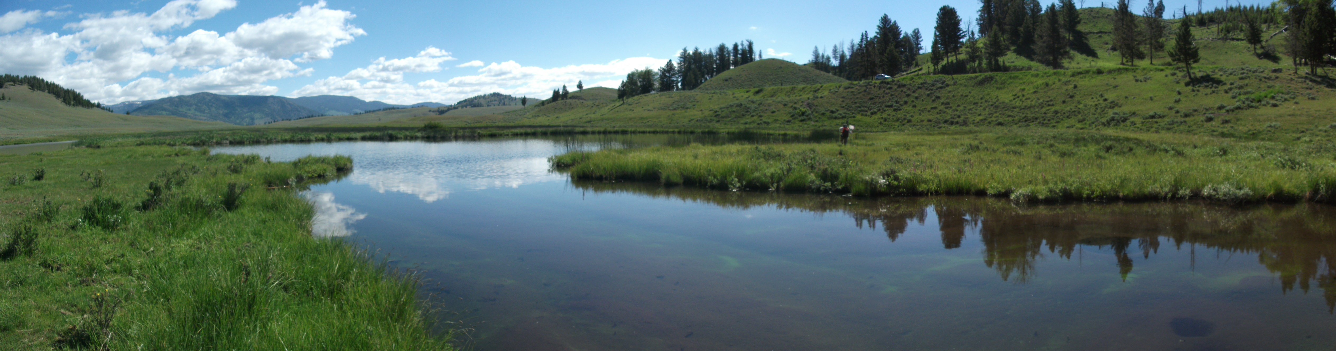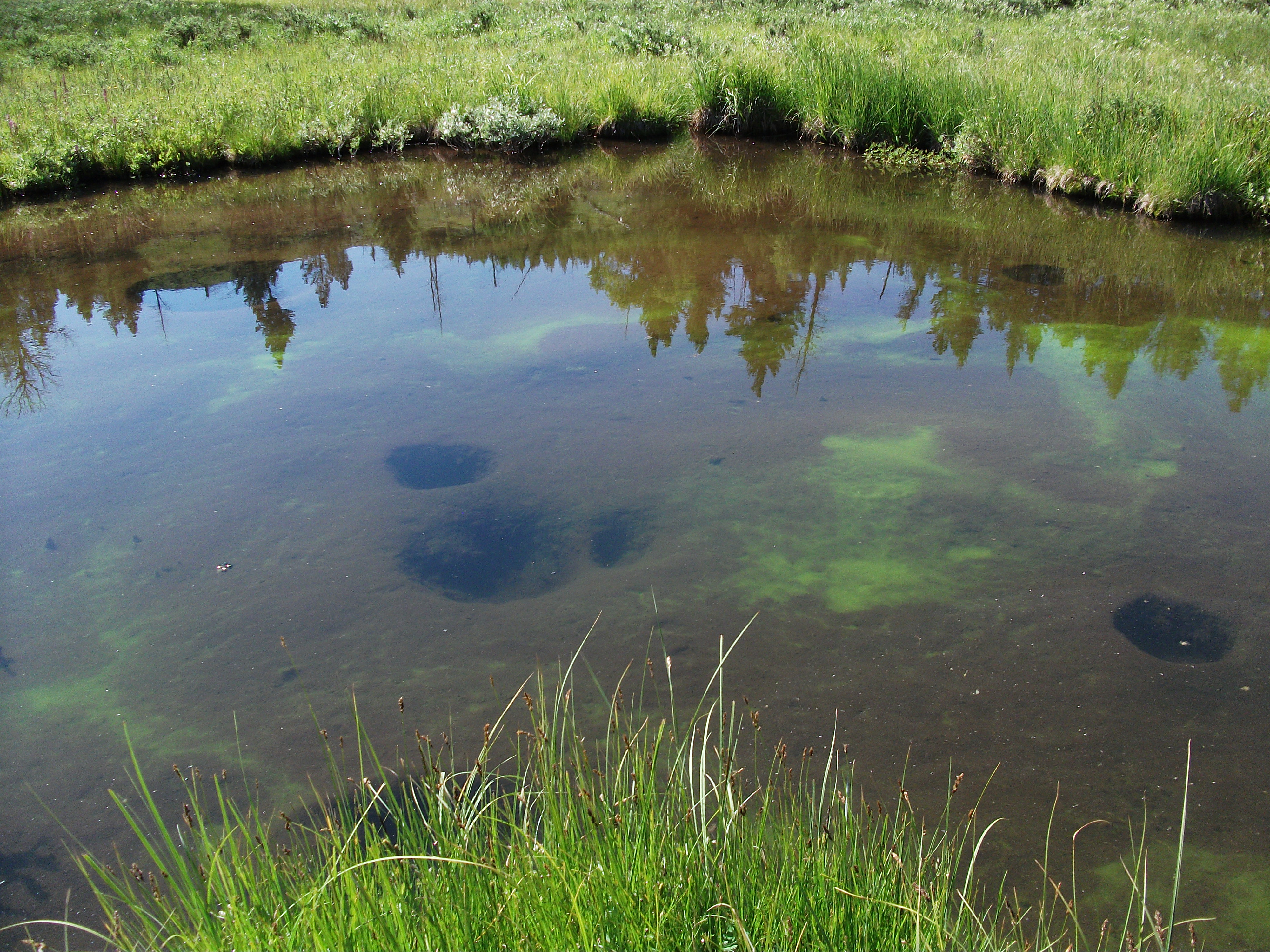 Surveying the periphery of Blacktail Pond (aka. Shaky Lakes) is like surveying the moon. It feels very much like you’re bopping around on unknown, untested terrain. It takes hours of navigating through quicksand shorelines, animal bones (some sun-bleached and some too fresh for comfort), a bounty of sunning snakes, aggressive nesting birds, thousands of trout fry and the occasional large adult, tons of fluorescent blue and green shrimp tooling around, only to find two tadpoles! However, it’s more than crews have found in previous years. The shoreline is such a perilous mess that a few years ago a field crew member got sucked into the muck and sprained his ankle trying to get back out. We now have to wear ropes so that we can be rescued if the awful need arises.
